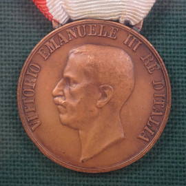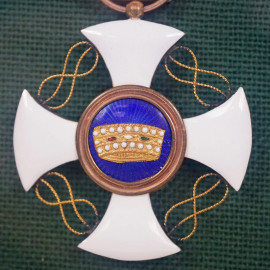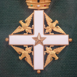Lotto di quattro medaglie: Medaglia Commemorativa della "Marcia su Roma" 1922, Medaglia "Unità d'Italia" 1848-1918, Croce da commendatore dell'Ordine della Corona d'Italia, Croce Cavaliere Ordine al Merito Repubblica Italiana, entro cornice, cm 21,5x33,5