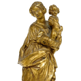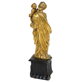 Madonna con Bambino benedicente, scultura in bronzo dorato, XVIII-XIX secolo, cm h 14, poggiante su base in legno ebanizzato