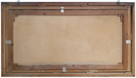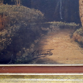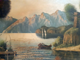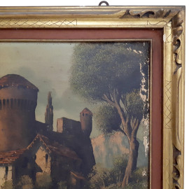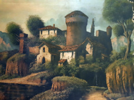 Maestro del Novecento, Paesino sul lago, grande dipinto ad olio su tela dei primi del 900, cm 60x120, firmato, con cornice coevA