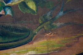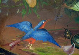 Natura morta con uccellino e insetti, olio su tela, cm 54,5x76,5, XIX-XX secolo, entro cornice