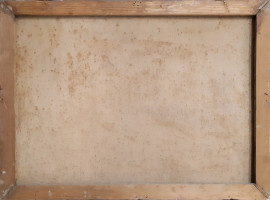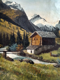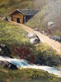 Paesaggio montano con casolari e ruscello, olio su tela del 1931, cm 42x58, firmato e datato in basso a destra