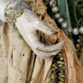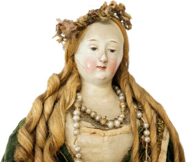 Santa Rosalia, in ceramica dipinta con abiti in stoffa, Italia meridionale, XIX secolo, cm h 58, base in legno, (difetti, mancanze)