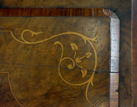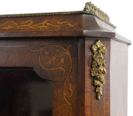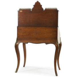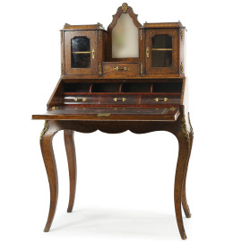 Scrittoio a ribalta bonheur du jour, fine XIX secolo, impiallacciato in varie essenze con decori ad intarsio, quattro gambe ricurve e applicazioni in metallo dorato, cm h 141x87,5x53,5