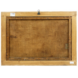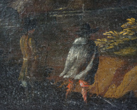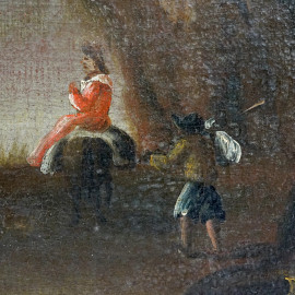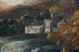 Scuola italiana del XVII secolo, Paesaggio lacustre con viandanti, olio su tela, cm 63,5x94,3, entro cornice