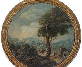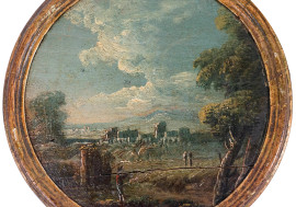 Sei piccoli dipinti tondi raffiguranti paesaggi, olio su tavola, XIX secolo, diametro tot. cm 18.5, (difetti)