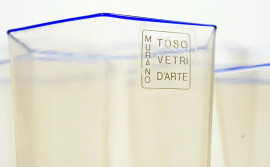Servizio di bicchieri di Murano, Toso Vetri d'Arte, XX secolo, con profili blu, composto da 14 bicchieri da cocktail, 5 bicchieri grandi e 7 bicchieri piccoli, h max cm 13, (incompleto)