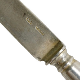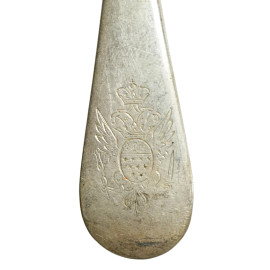 composto da: 24 forchette, 12 cucchiai, 12 cucchiai piccoli, 11 cucchiaini, 22 forchette piccole, 11 cucchiai a forma di foglia, 12 forchettine, un mestolino, un cucchiaio da portata e un mestolo, 23 coltelli, 24 coltelli piccoli e 2 posate da portata (difetti e mancanze)
