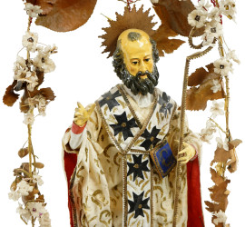 Statua rappresentante San Nicola, XX secolo, altezza cm 82, entro teca in vetro
