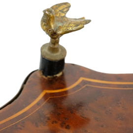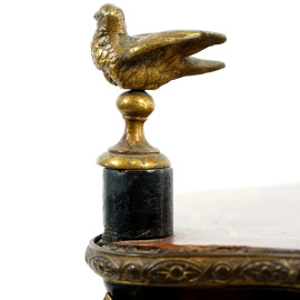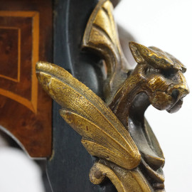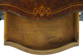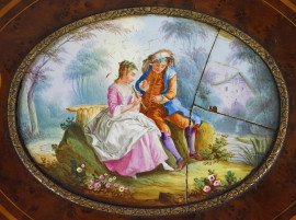 Tavolinetto in legno intarsiato in varie essenze, XX secolo, di forma mistilinea, con quattro gambe mosse ebanizzate inframezzate da ripiano, inserti in metallo dorato, piano centrato da medaglione in ceramica policroma rappresentante una scena galante, cm h 85x47x36,5 (difetti e mancanze)