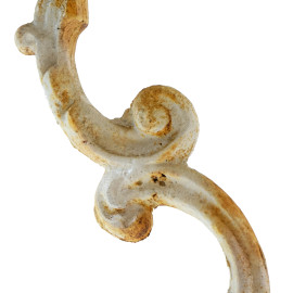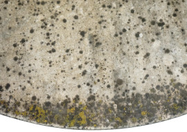 Tavolo di linea tonda, con piano in marmo, base in ghisa laccata bianca, XX secolo, cm h 74,5, diam. 75,5, (difetti)