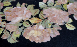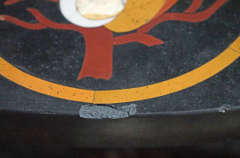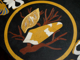 Tavolo in pietra lavica con piano circolare in commesso di marmi policromi, XX secolo, diametro cm 130, altezza cm 75