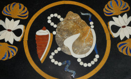 Piano centrato da una ghirlanda di rose contornata da riserve circolari con decori raffiguranti conchiglie, perle e coralli.