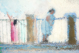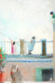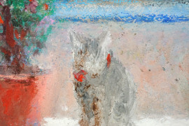 Terrazza con gattino, olio su cartone, cm 21x15,5, XX secolo, entro cornice