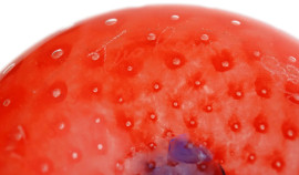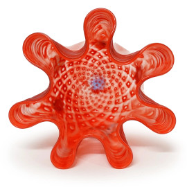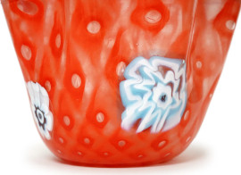 Vaso a fazzoletto in vetro soffiato, Murano, XX secolo, realizzato con lavorazione a bolle nei toni del rosso e con murrine bianche e celesti, dedica e firma del mastro vetraio sotto la base, cm h 18