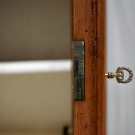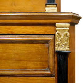 Vetrina stile impero a due corpi in legno di ciliegio del XIX secolo, quattro ante e due cassetti, decorato con lesene scanalate ed ebanizzate con capitelli intagliati e dorati, cm 146X240X50