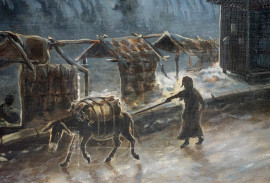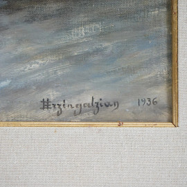 Accampamento con asino e figure, olio su tela, firmato e datato in basso a destra Herzingatzian 1936, cm 50x77, (difetti)