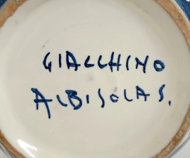 Albarello in maiolica Savona, Albisola, XX secolo, a smalto bianco e blu con cartiglio recante scritta apotecaria, firmato sotto la base da " Giacchino Albisola S.), cm h 17, difetti