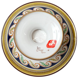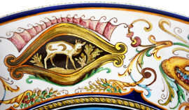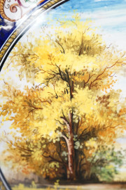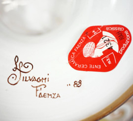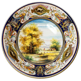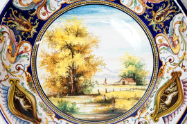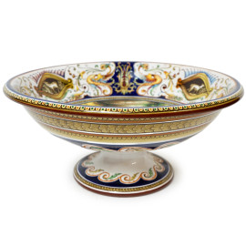 Alzata centrotavola in ceramica policroma, Laura Silvagni, Faenza, 1988. Cavetto raffigurante paesaggio campestre e tesa a grottesche e cervi, cm h 17x36,5