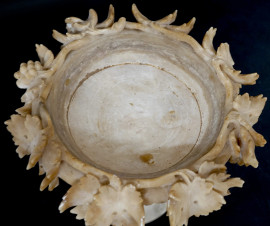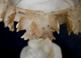 Alzata in alabastro con decori a foglia di vite e fusto a foggia di tre delfini intrecciati, diametro cm 36, altezza cm 29