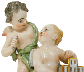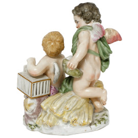 Amorini con uccellino e gabbietta, gruppo in porcellana policroma, Höchst, XIX secolo, cm h 15,5