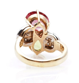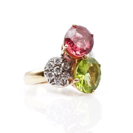 Anello in oro 18 Kt con 14 brillantini, due tormaline colorate, misura 15, peso gr. 11,6