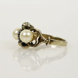 Anello in oro 18 kt con fiore centrale impreziosito da zaffiri con due perle ai lati, misura n. 16, peso gr. 5,2