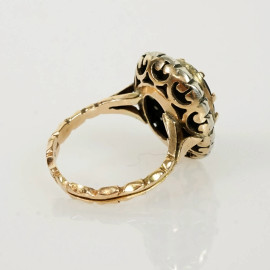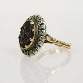 Anello in oro, argento e diamanti con cammeo di madreperla intagliata raffigurante auriga, misura n. 13, peso gr. 5,7, (imperfezioni)