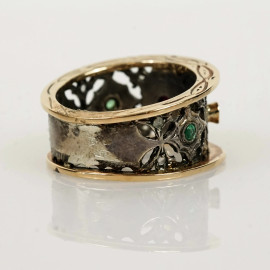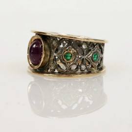 Anello in oro basso e argento impreziosito da rubino taglio cabochon e smeraldi, misura n. 12, peso gr. 7