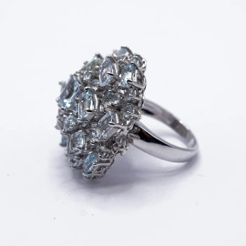 Anello in oro bianco 18 kt con acquamarina 11 ct e diamanti 0,50 ct, misura n.13, peso gr. 14,7