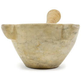 Antico mortaio in marmo bianco con pestello in legno (non pertinente), cm 15x25.5