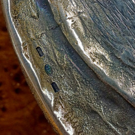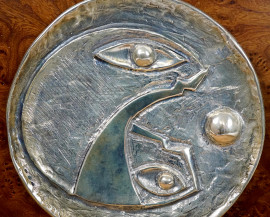 Antonino Rando, Gioco, piatto in argento montato su pannello in radica, diametro cm 14.5, con allegato certificato, entro scatola in sughero