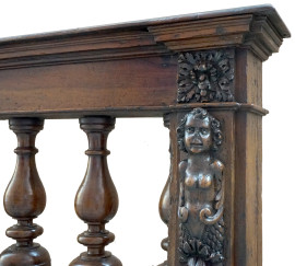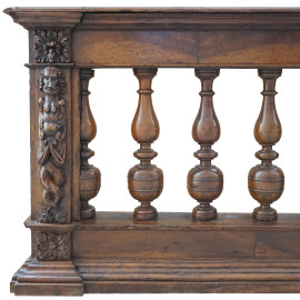 Balaustra in massello di noce scolpito, XIX secolo, cm h 89,5x273x52, (segni del tempo)