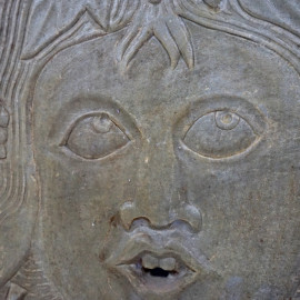 Bassorilievo in marmo grigio raffigurante un volto femminile con tralci d'uva, XX secolo, cm 50,5x41