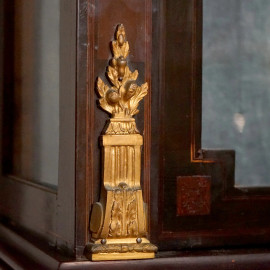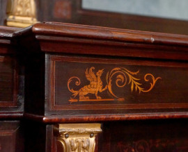 Bookcase in mogano, XX secolo, doppio corpo con tre ante a vetri nella parte superiore e tre sportelli sottostanti, particolari intarsiati a motivi vegetali, applicazioni in metallo dorato, cm h 247x202x57, (difetti)