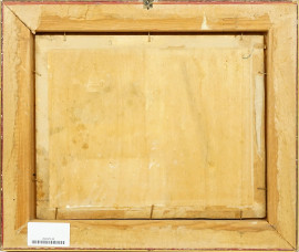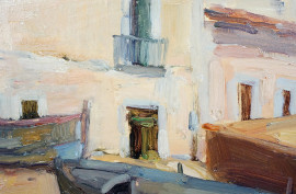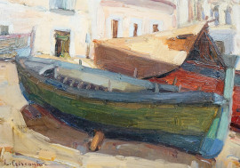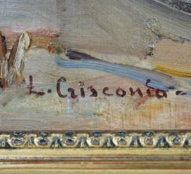 Borgo di mare, olio su compensato, firmato in basso a sinistra, cm 24,5x31, entro cornice.