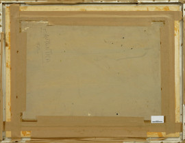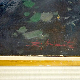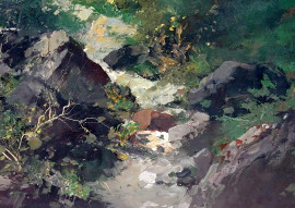 Bosco con ruscello, olio su cartone, firmato in basso a destra, cm 49x70, entro cornice