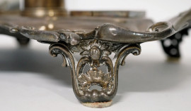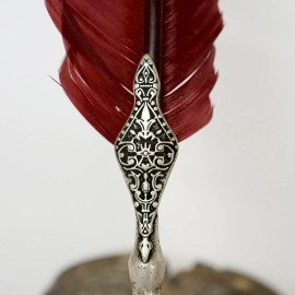 Calamaio in metallo argentato con ampolla in vetro e penna stilografica, cm 14x33,5x22,5, (difetti e mancanze)