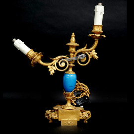 Candelabro a due fiamme in bronzo dorato e porcellana policroma, XIX-XX secolo, trasformato a lampada, cm h 38,5, (difetti, parte rotta)