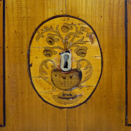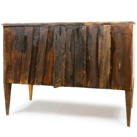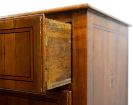 Cassettone Luigi XVI, in legno impiallacciato ed intarsiato in varie essenze, fronte a due cassetti, gambe dritte, cm 96x126x65, (parti sostituite, restauri del XX secolo, difetti)
