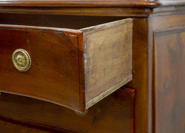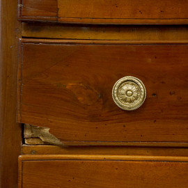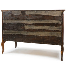 Cassettone piemontese, XVIII secolo, fronte di linea mossa a tre cassetti, quattro gambe arcuate, cm h 93x132x54, (difetti e restauri)