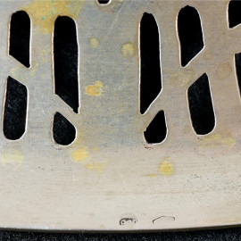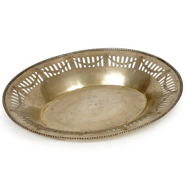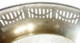 Centrotavola di linea ovale in argento traforato e inciso con decori a festoni, manifattura italiana, XX secolo, titolo dell'argento 800, peso gr 372, cm 28,5x22,7x3,6