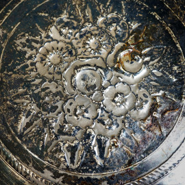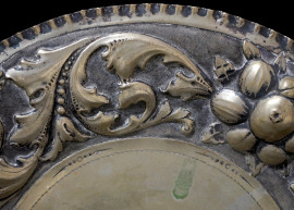 Centrotavola in argento sbalzato e cesellato, cavetto con decori floreali incisi, tesa decorata a motivi vegetali, punzoni sotto la base, cm 35,5x6, peso gr. 864, (difetti)