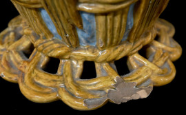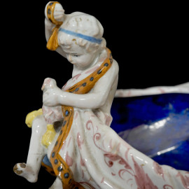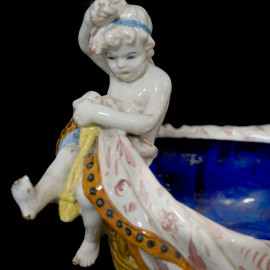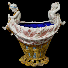 Centrotavola in maiolica policroma a forma di cesto con due putti, diametro cm 20, altezza cm 29 (difetti)