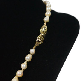 Collana di perle con chiusura traforata in oro 18 Kt, lunghezza cm 52, peso gr. 36,8