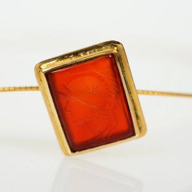 Collana girocollo in oro 18 kt con ciondolo in pasta vitrea incisa, lunghezza cm 41 circa, peso gr. 15,8