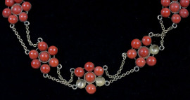 Collana in oro basso e corallo, lunghezza cm 49, peso gr. 28,1, (mancanze, imperfezioni)