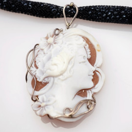 Collana in rete tubolare e perline con ciondolo cammeo raffigurante profilo femminile, lunghezza cm 46,5