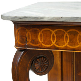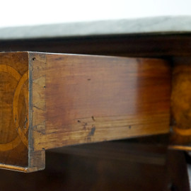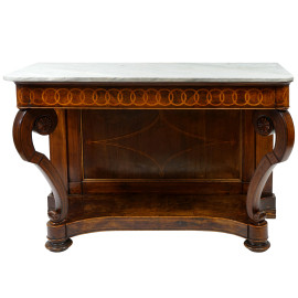 Consolle Carlo X in legno intagliato e intarsiato in varie essenze, piano in marmo, gambe sagomate raccordate da traversa, XIX secolo, cm h 94x134x59