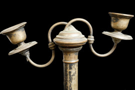 Coppia di candelabri a tre fuochi in metallo argentanto, prob. Francia, fine XIX secolo, altezza cm 31 (difetti e rotture)