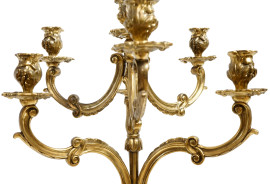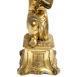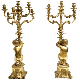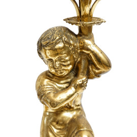 Coppia di candelabri in bronzo dorato a sette fiamme, con fusto a foggia di putto, XX secolo, altezza cm 87, (difetti)